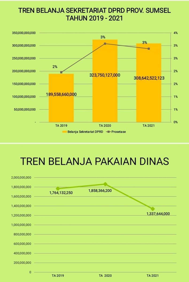 Menurut Fitra Sumsel, tren belanja Sekretariat DPRD Sumsel mengalami peningkatan dari tahun 2019 hingga 2021. Tercatat ada sekitar Rp198 miliar pada anggara belanja 2019, atau naik menjadi Rp323 miliar pada 2020. Kendati kembali menurun menjadi Rp308 miliar pada 2021.
